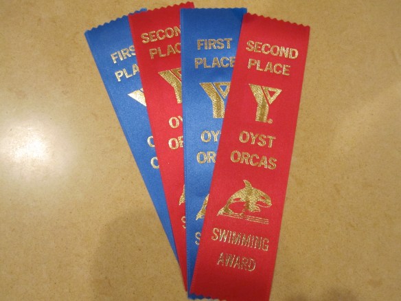 Fourteen brought them home from a recent meet. I used to store mine in a cigar box with my baseball cards. Not all of mine were blue and red though! The beauty of swimming for the Y is they’re never very strong teams, so here’s the formula: 1) pretend there are no uber-fast club swimmers; 2) load up on blue and red nylon goodness; and 3) bask in heightened self-esteem.