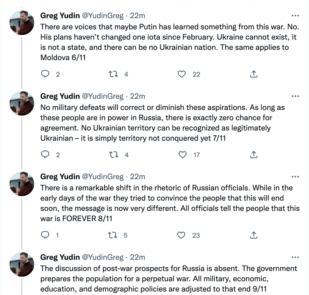 Prospects For Peace Are Bleak Posted on November 20, 2022 by Ron Byrnes This insider perspective is one of the things I’ll miss most about Twitter if it crashes and burns. Yudin is Head of Political Philosophy at The Moscow School of Social and Economic Sciences Share this: Click to share on X (Opens in new window) X Click to email a link to a friend (Opens in new window) Email Click to print (Opens in new window) Print Click to share on Reddit (Opens in new window) Reddit Click to share on Facebook (Opens in new window) Facebook Click to share on LinkedIn (Opens in new window) LinkedIn Like Loading... Related