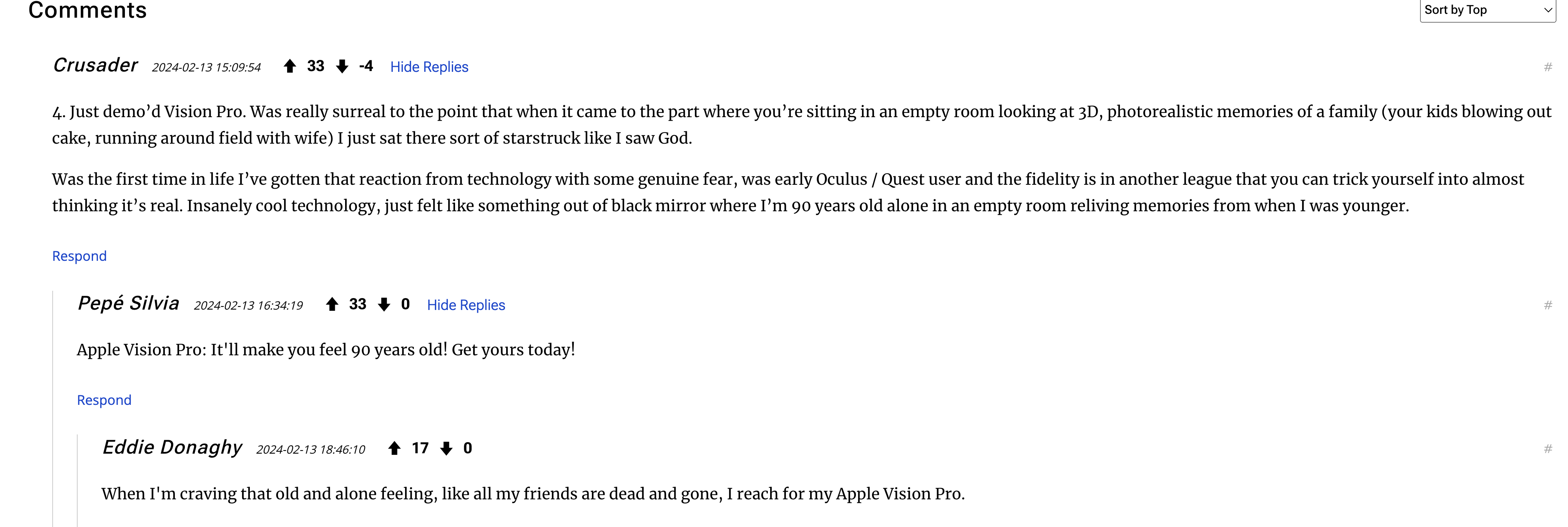 Dig this exchange of commenters on a review of Apple’s new Vision Pro.