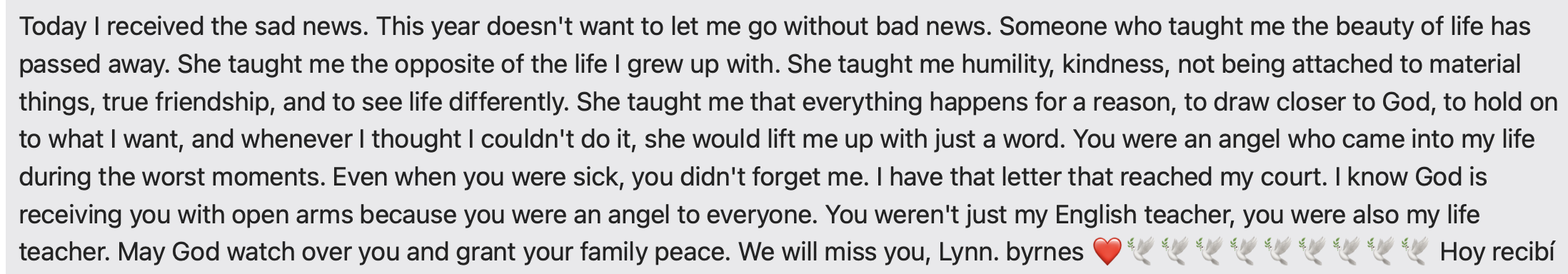 A friend forwarded this message today from Lynn’s former student Miriam.