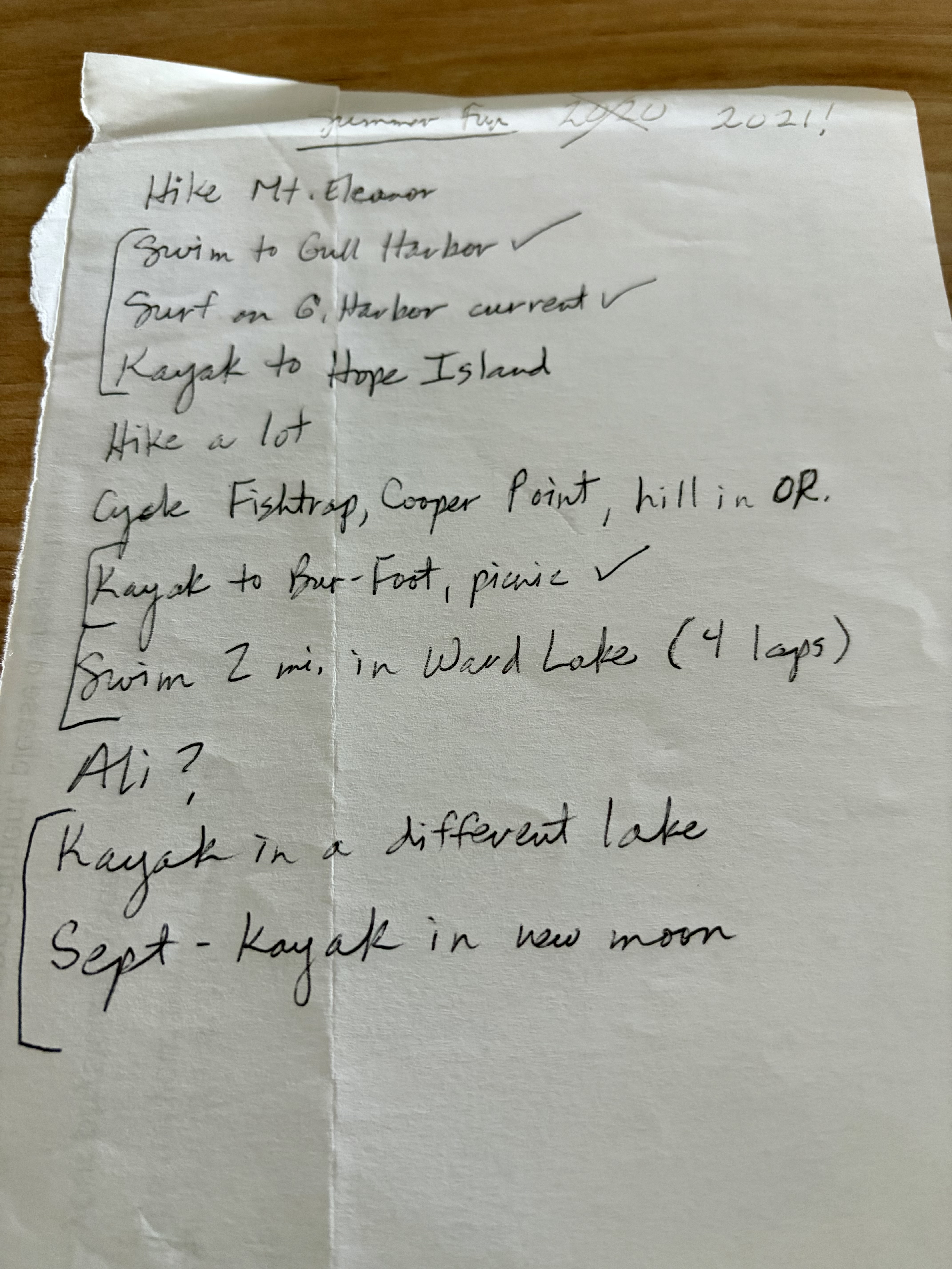 And I stumbled across the attached picture. The crossed out “2020” speaks to some procrastinating, but I love how dang aspirational her list was. Ward Lake laps, haha. The “Oregon hill” is McKenzie Pass which I raved to her about after each of my ascents.