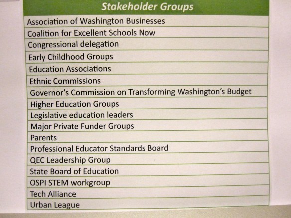 Granted, there’s never a perfect example. Turns out there are a couple of classroom teachers on the Professional Educator Standards Board, and I’m not sure, but there may be a few more lurking within other groups. But Washington State deserves major credit for articulating goals and planning how to meet them with teachers almost entirely excluded.