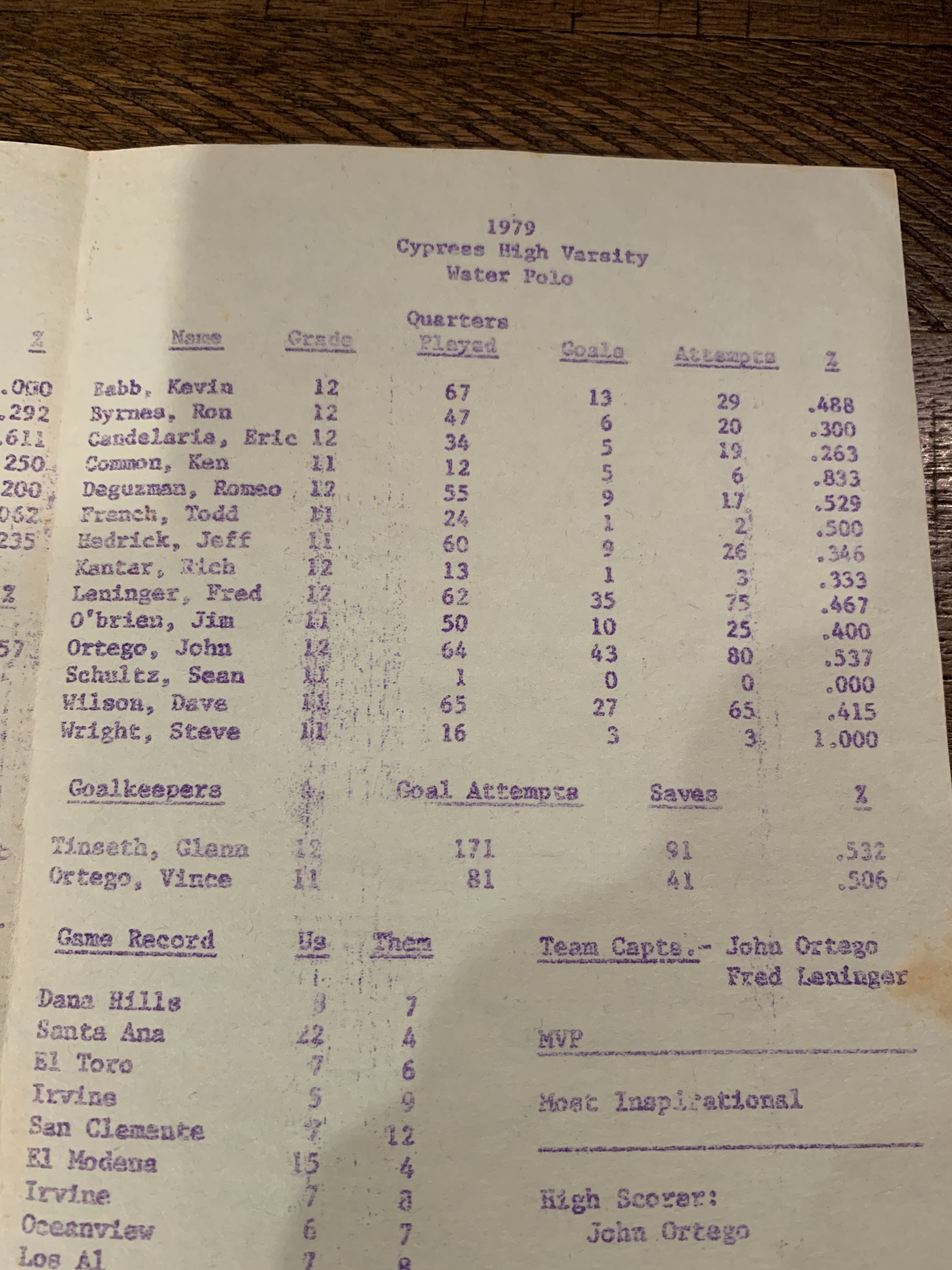 Speaking of history, last night the GoodWife and I had dinner with SWright, KBabb, and CBabb in suburban Irvine (redunant). After a wonderful dinner and desert, KBabb busted out some Cypress High School memorabilia including the 1979 Varsity Water Polo Team stat sheet.